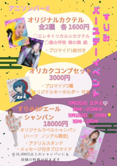 🌈イベント日程まとめ🌈🟥すりみちゃんBD 2Days11月28日㈮&29日㈯リアルBD⇒11月25日㈫⚡️💖オリジナルカクテル販売中💖⚡️🟦アニソンバーX ✖️ マジョリカ💖第3回コラボシャッフル営業 💖✅数量限定💓当日限定コラボグッズ発売...